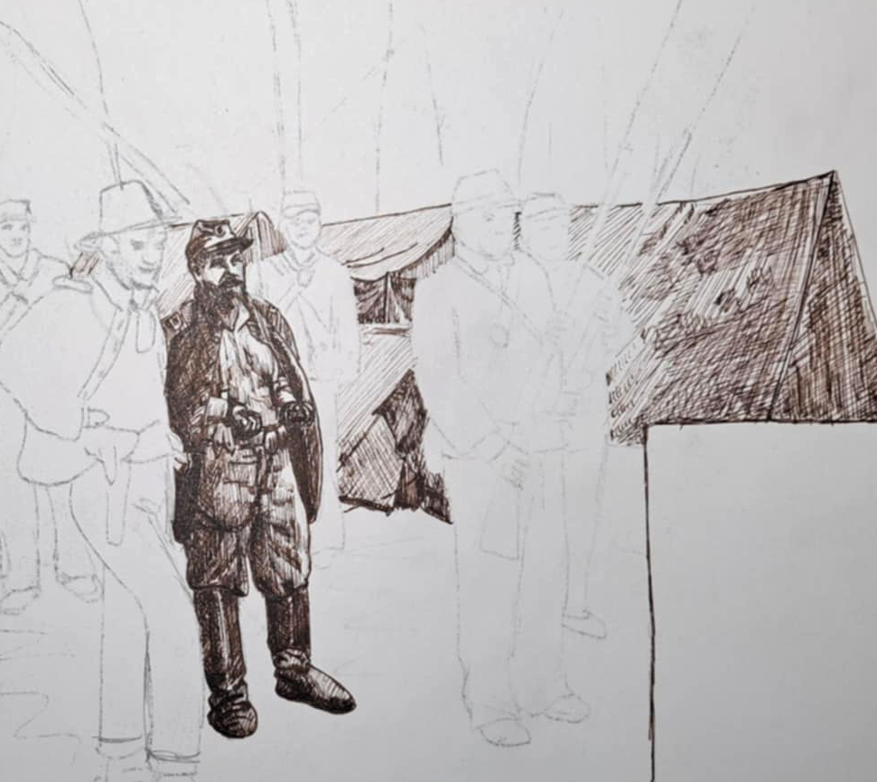 Here is the accused, flanked by soldiers familiar to him, as he is presented by one very cocky First Lieutenant. I am using my favorite pen for drawing which gives me a nice brown color. I prefer this pen because the ink has a warm tone that adds some body to the lines.