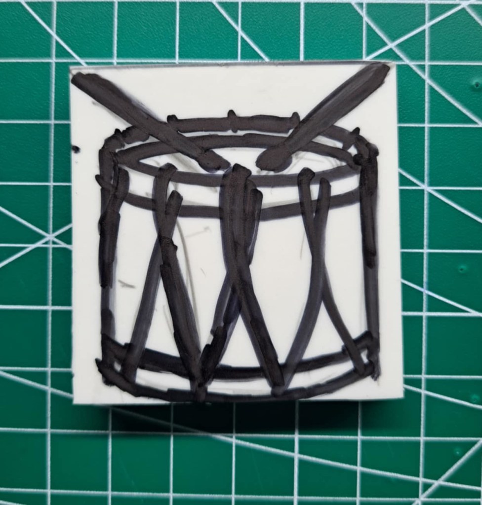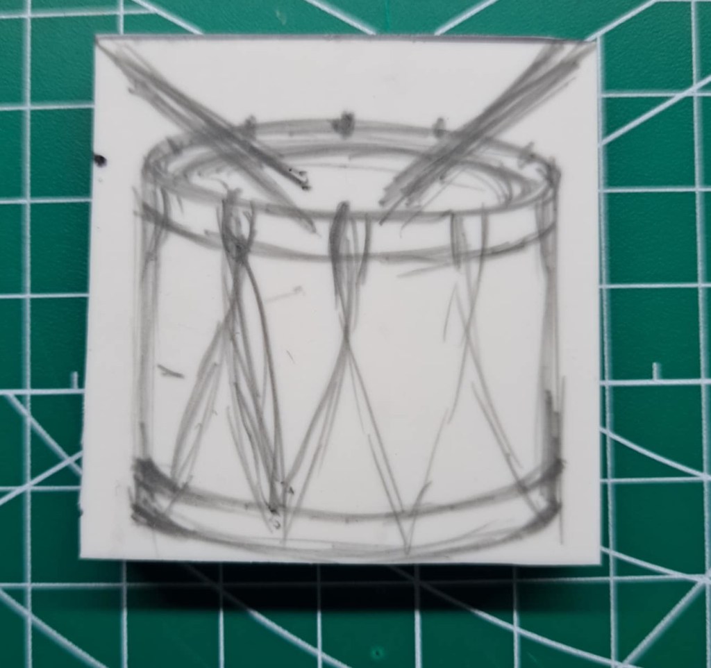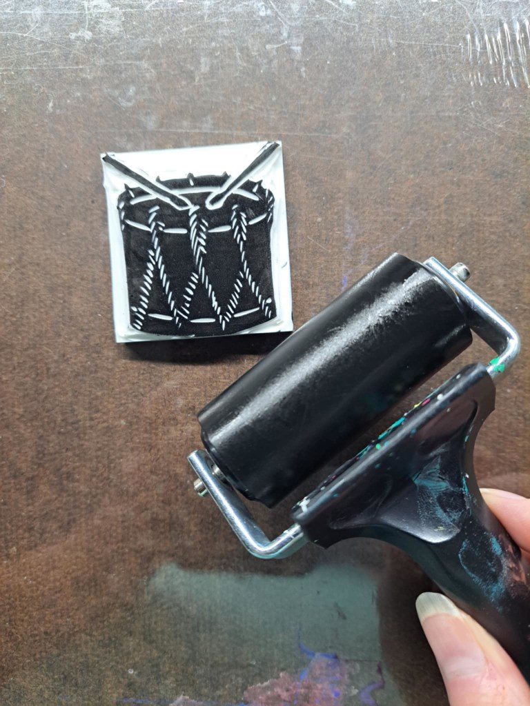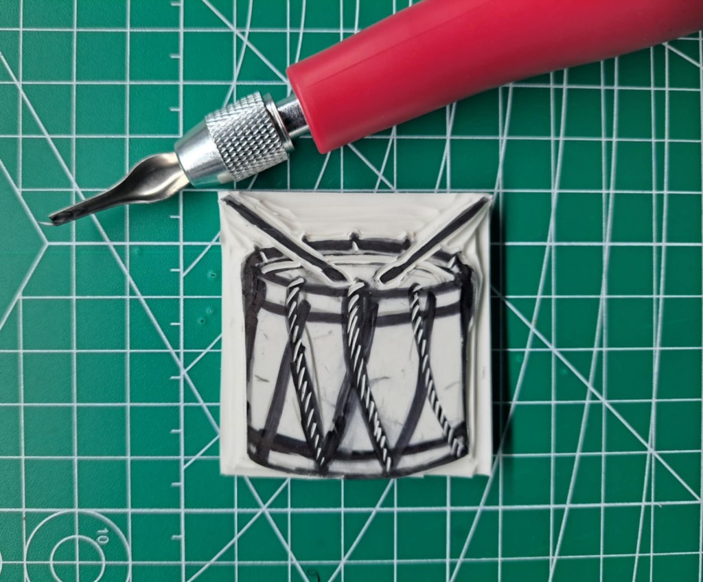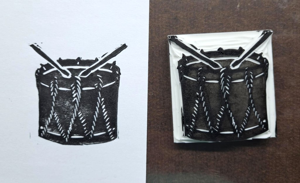 A small 2″ by 2″ linoblock of a drum. Here is the process from drawing concept to printed image.